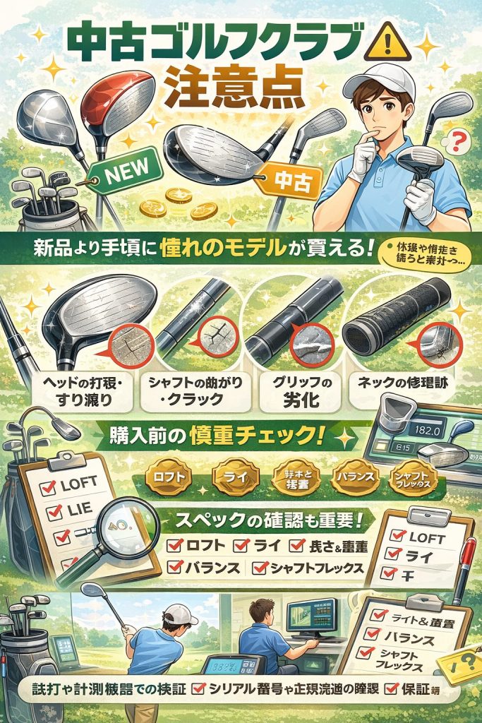 注意点としては目に見えないダメージやシャフトの経年劣化、グリップの摩耗が挙げられます。購入前にこれらを確認しないと短期で買い替えが必要になることがあります。
